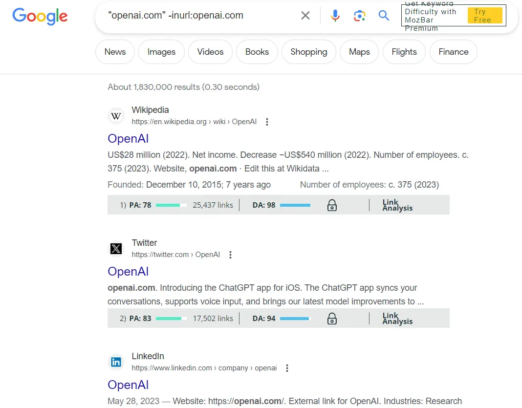 "competitorwebsite.com" -inurl:competitorwebsite.comFor example, I can use that to find backlinks to Openai