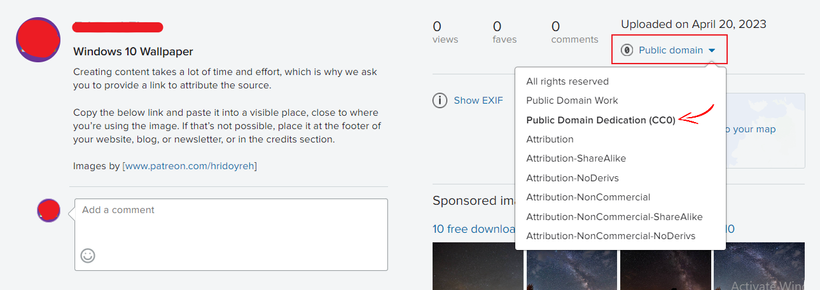 - Change the license for each image to “Creative Commons CCO” or “Public Domain Dedication”. This waives all copyright and allows commercial use and modification.