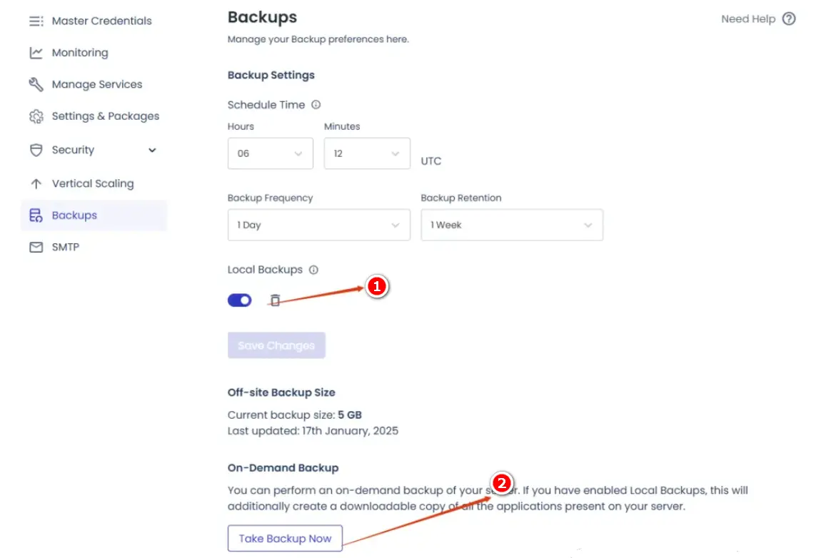 Head over to Cloudways, locate the Backup feature, enable Local Backups, then hit Back Up Now and wait for the process to finish.