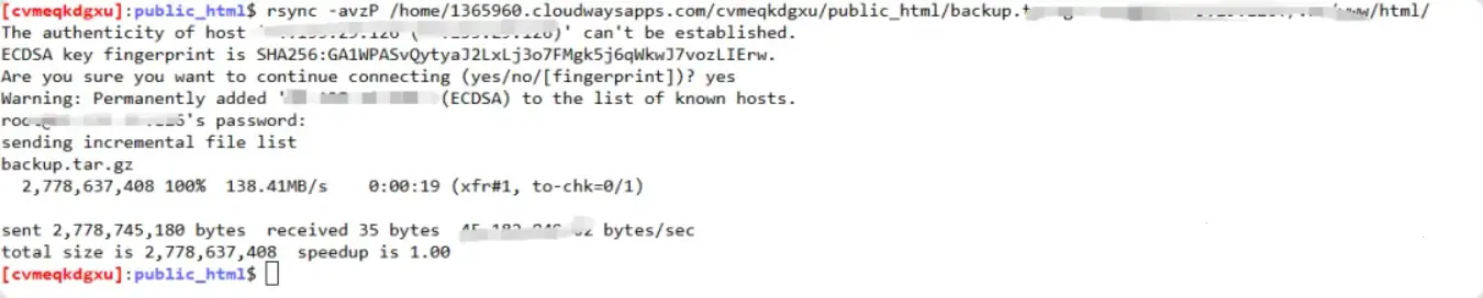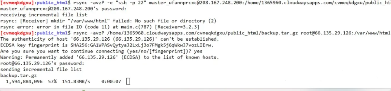 rsync -avzP -e "ssh -p 22" master_ufannprcxc@208.167.248.200:/home/1365960.cloudwaysapps.com/cvmeqkdgxu/public_html/backup.tar.gz /var/www/html/If you don’t know the Cloudways file path, query with the following command